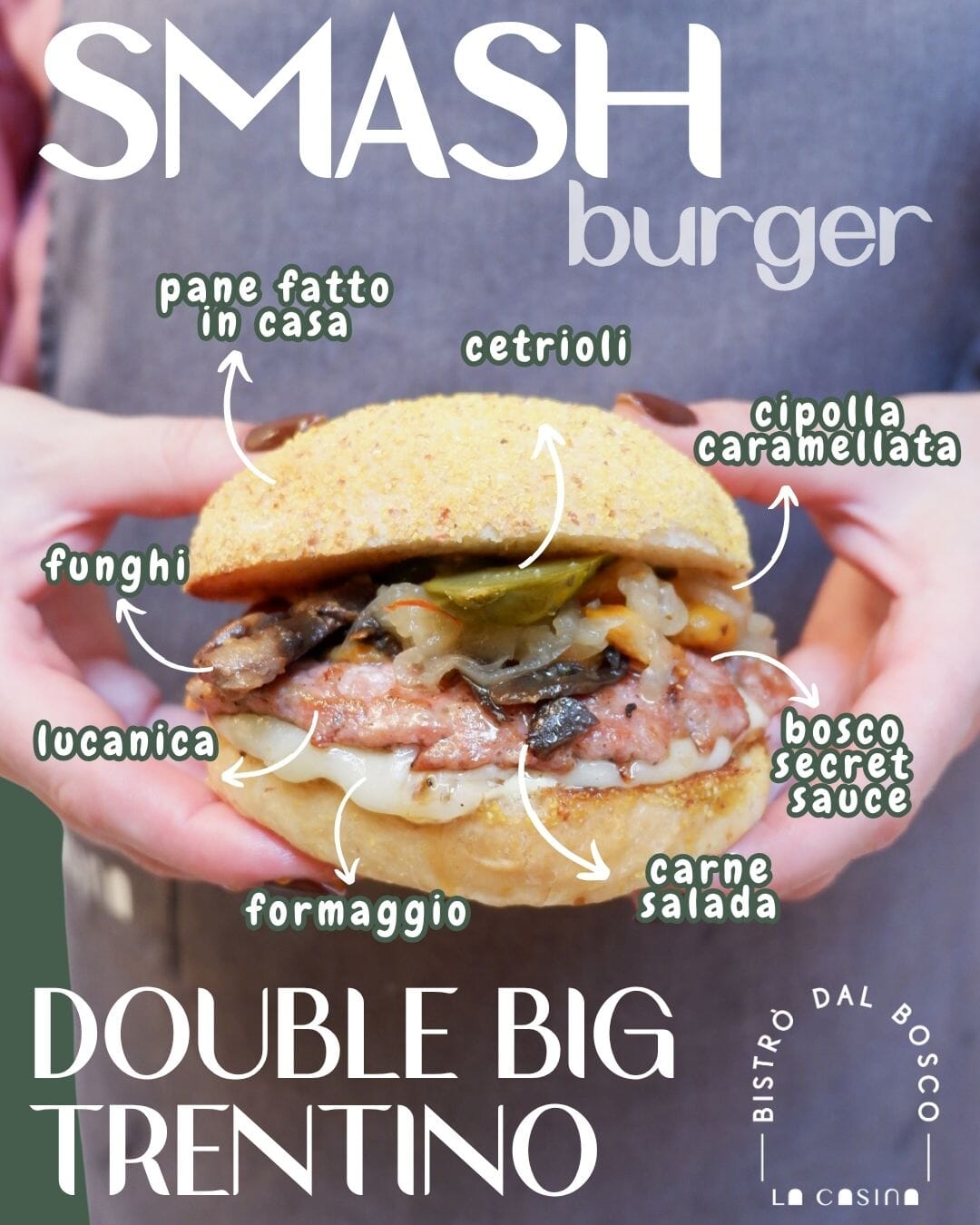 Carne salada + smash di lucanica, bosco secret sauce, cetrioli, funghi, formaggio trentino.