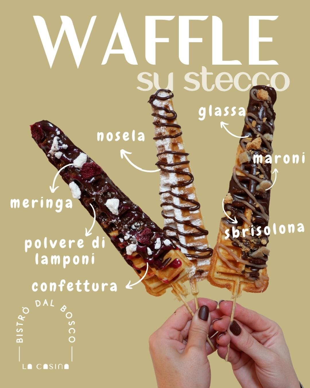 Waffle su stecco Una coccola dolce che conquista tutti in tre varianti: Maroni, Piccoli frutti, Nosela